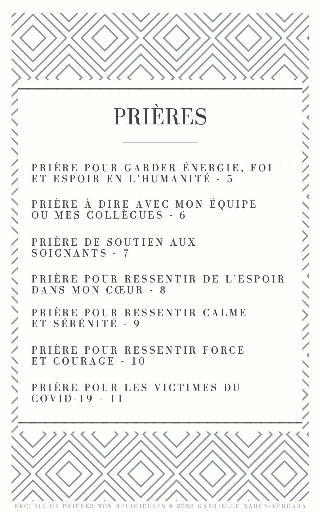 Droits d’auteur et diffusion de cet eBook et de son contenu : je suis l’auteure de toutes les prières et de tous les textes (à part les citations, attribuées à leurs auteurs respectifs) présents dans ce recueil, qui sont protégés par des droits d’auteur. Vous pouvez les citer ou les diffuser en me créditant et en me demandant l’autorisation à l’adresse gabrielle@les-nebuleuses.com. Cet eBook ne peut pas être vendu ou diffusé à d’autres personnes que l’acheteur sans mon autorisation. Merci !